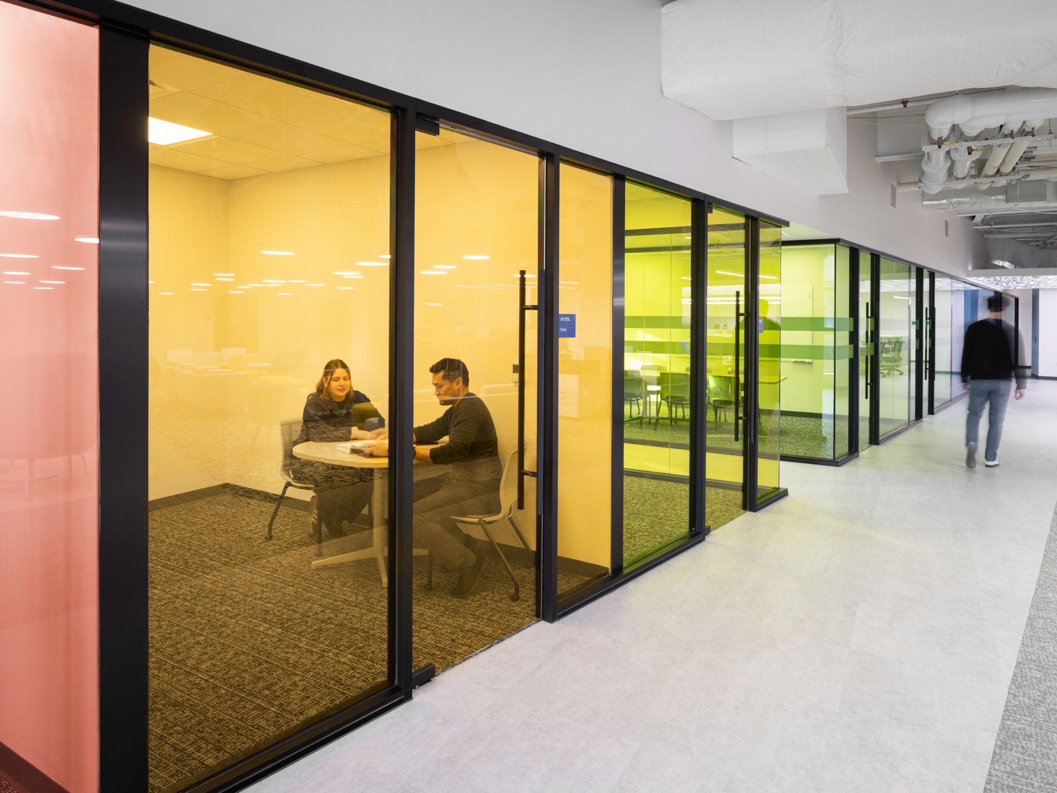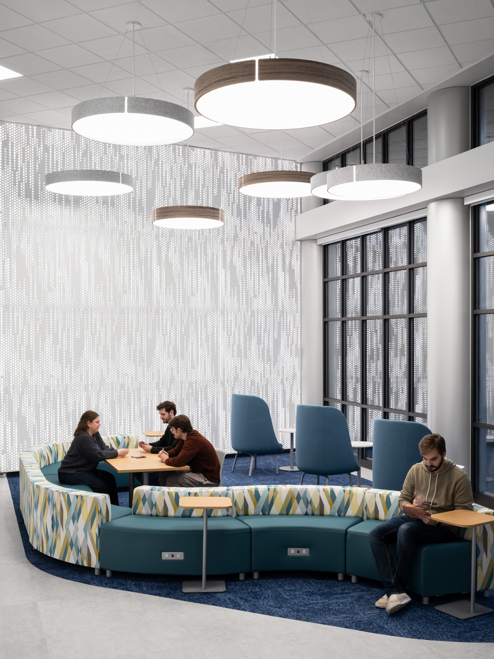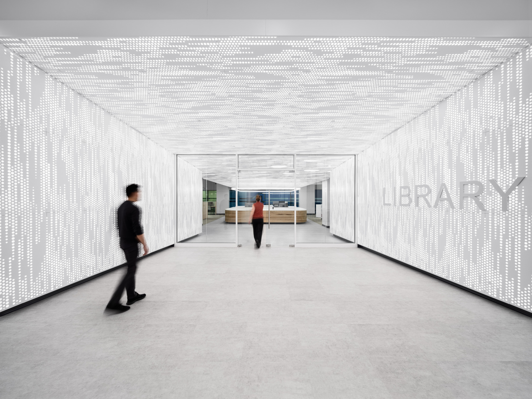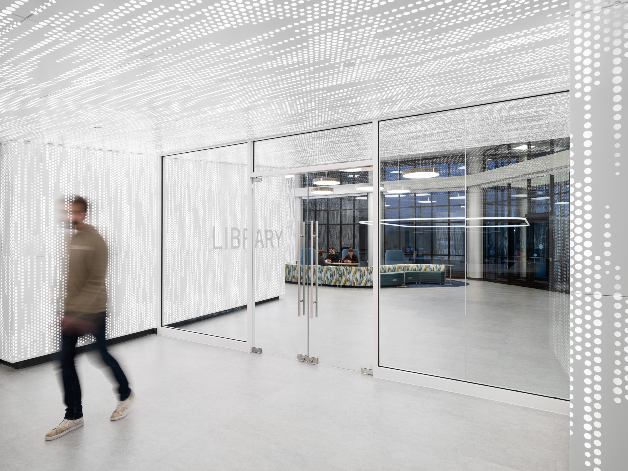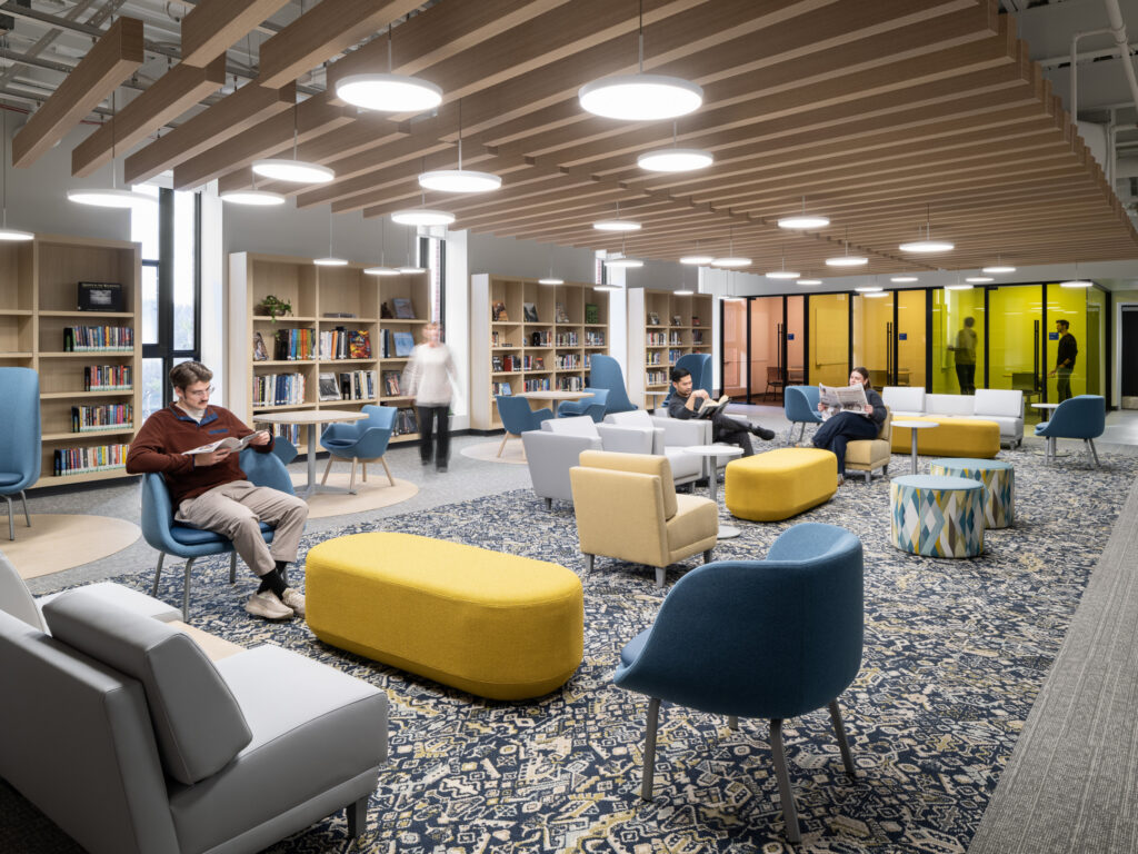 The front entry opens into a light-filled lobby anchored by a prominent circulation desk that serves as the focal point of the space. Beyond, a grand reading room supports quiet study, complemented by individual and group study rooms, private computer workstations, collections and periodical areas, and a conference center. Together, these spaces create a flexible environment that supports both focused study and collaboration.