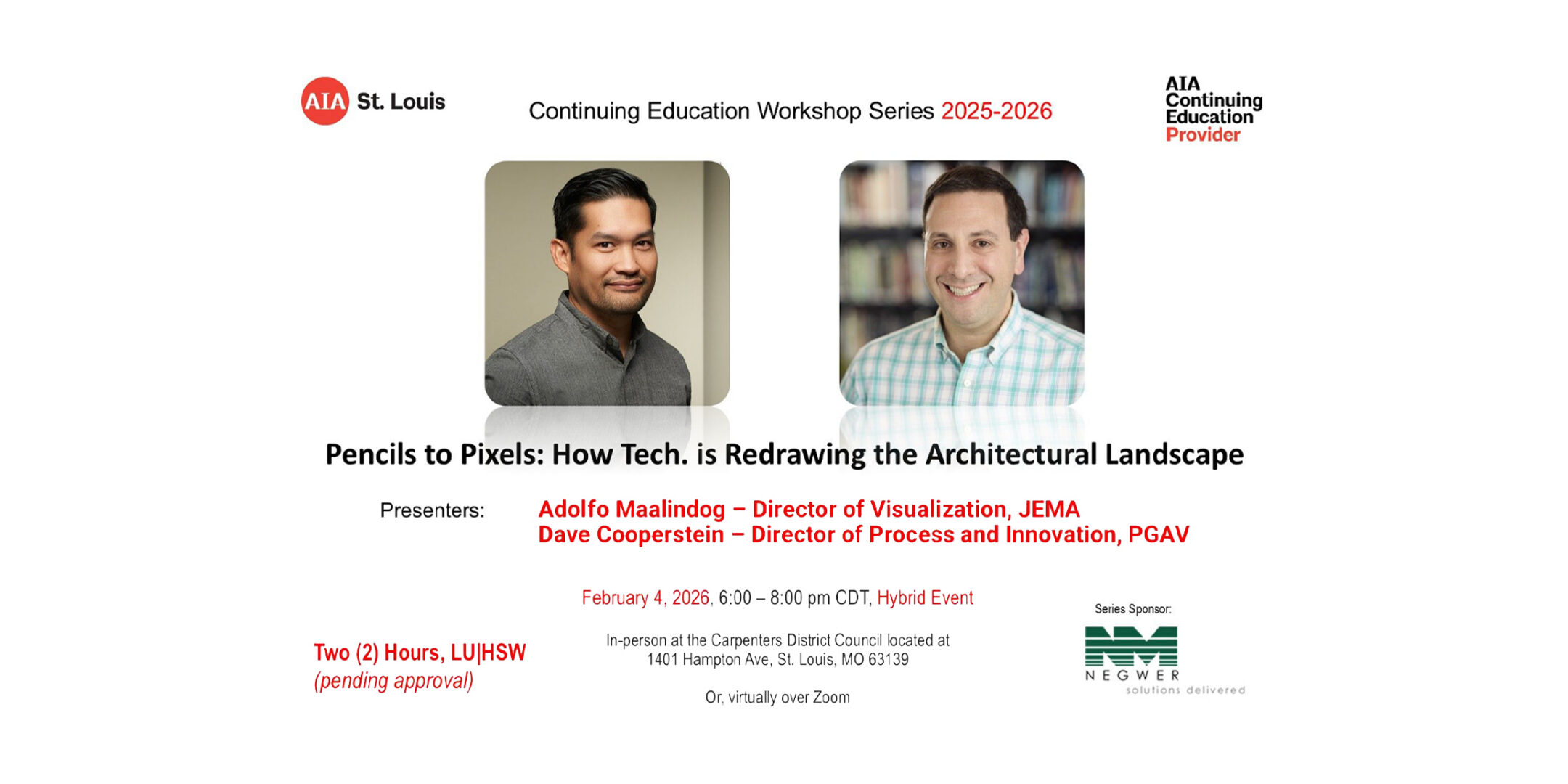 JEMA is excited to share that Adolfo Maalindog, Director of Visualization, will be presenting at the upcoming AIA St. Louis Continuing Education Workshop Series program, Pencils to Pixels: How Technology is Redrawing the Architectural Landscape. Adolfo and Dave Cooperstein of PGAV Destinations will explore how digital visualization tools are transforming the way architects design, communicate, and collaborate. The program highlights how evolving technology is reshaping workflows and strengthening connections between designers, clients, and project teams. The event will take place on Wednesday, February 4, from 5 to 8 PM Central at the Mid-America Carpenters Regional Council.